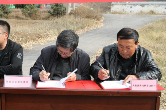 陜建延安建投集團總經理苗壯(左)與吳起縣周灣鎮小口則村支部書記雷鳴寬(右)代表雙方簽訂推銷協議。