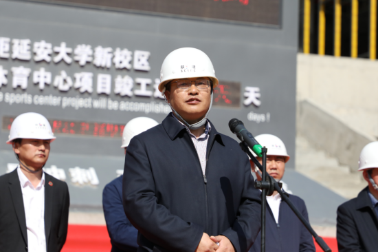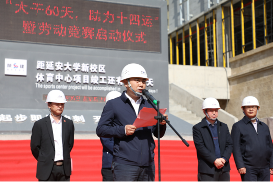 延安大學黨委委員、副校長楊偉宏致辭,他代表延安大學全體師生向疫情期間奮戰在一線的施工人員及陜建集團表示衷心感謝,對十三建公司承建的延大體育中心項目建設給予充分肯定。他指出,延安大學體育中心項目作為十四運重點建設項目,意義重大。當前,項目建設進入60天倒計時,希望全體參建人員從延安精神中汲取力量,大力弘揚愛崗敬業、艱苦奮斗的勞模精神,進一步統一思想,提高認識,鼓足干勁,用一流的速度,一流的品質,展現陜建集團的國企風采和責任擔當,為第十四屆全運會順利召開貢獻力量。