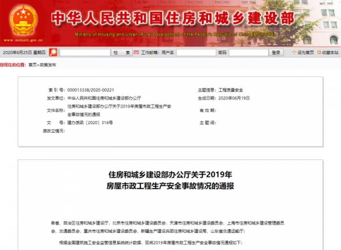 日前,住建部辦公廳下發《關于2019年房屋市政工程生產安全事故情況的通報》,要求,2020年,各地要深入查找本地區安全生產工作的薄弱環節和突出問題,推動防范化解施工安全重大風險各項部署落地見效,堅決遏制重特大事故。