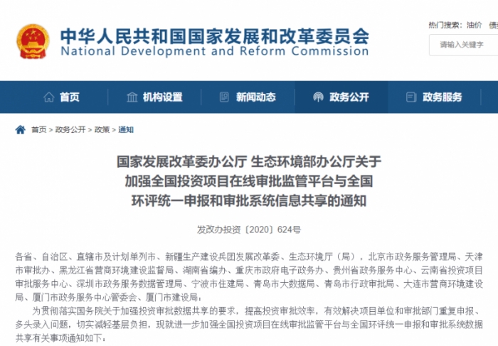 日前,國家發改委辦公廳、生態環境部辦公廳下發《關于加強全國投資項目在線審批監管平臺與全國環評統一申報和審批系統信息共享的通知》,要求各地要準確把握投資平臺的功能和定位,緊密結合各自審批系統的實際情況,大力推進投資平臺與相關審批系統的互聯互通,采取投資平臺與相關審批系統充分交互、由投資平臺提供多方共享的模式,加快實現項目單位一次申報、審批人員一次辦理。