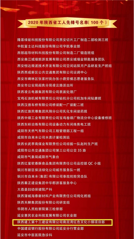 近日,陜西省三秦工匠、五一勞動獎表彰大會在西安隆重舉行,會議表彰了2020年三秦工匠 和陜西省五一勞動獎、工人先鋒號。陜西建工第十三建設(shè)有限公司南泥灣紅色文化小鎮(zhèn)項目部榮獲2020年“陜西省工人先鋒號”榮譽(yù)稱號。