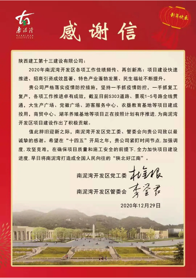 感謝信中提到,2020年陜建十三建公司嚴格落實疫情防控措施,堅持一手抓疫情防控,一手抓復工復產,各項工作推進卓有成效,截止目前S303道路、景觀1-5號路全線貫通,大生產廣場、黨徽廣場、游客服務中心、農墾教育基地等項目建成投用,商貿中心、湖羊養殖基地等項目正在按照計劃有序推進,為南泥灣開發區項目建設作出了積極貢獻。