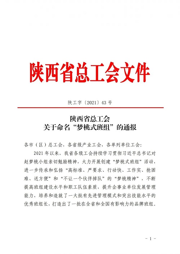 為進一步傳承和弘揚“高標準、嚴要求、行動快、工作實、搶困難、送方便”和“不讓一個伙伴掉隊”的“夢桃精神”,近日,陜西省總工會對全省50個優秀班組進行了榮譽表彰,授予他們“夢桃式班組”榮譽稱號,集團延安南泥灣勞模工匠學院項目科技創新班組獲此殊榮。