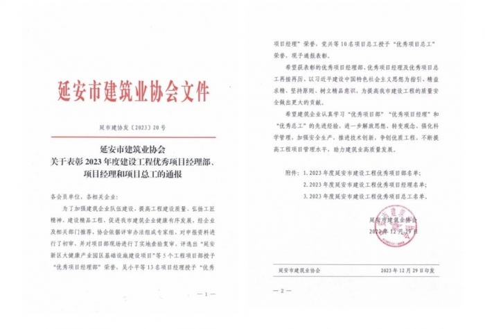 近日,延安市建筑業協會對2023年度建設工程優秀項目經理部、項目經理、項目總工進行了表彰。