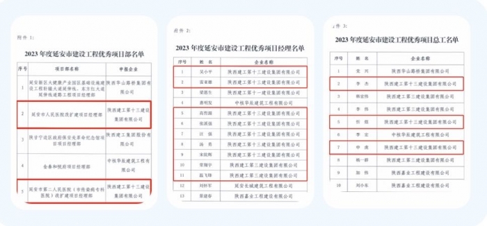 集團延安市人民醫院改擴建項目經理部、延安市第二人民醫院(市傳染病專科醫院)改擴建項目經理部、陜甘寧邊區政府保安處革命紀念館項目經理部被評為“2023年度延安市建設工程優秀項目部”;吳小平、雷亞雄、高哲源、張溪強、汪強、湯勇、宋院輝等人被評為“2023年度延安市建設工程優秀項目經理”;李杰、忻煜、申虎等人被評為“2023年度延安市建設工程優秀項目總工”。